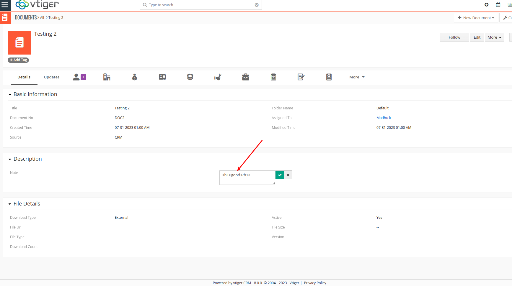 When editing the description box, it opens in edit mode with the HTML tags visible.